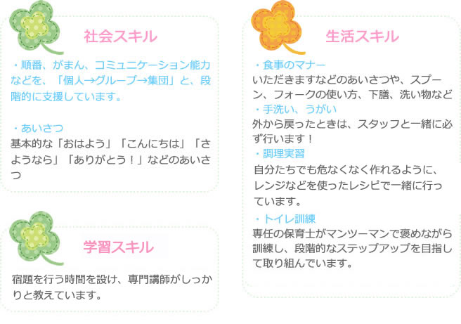 利用する方が可能な限り、地域での生活を継続できることを目的とし、日常生活における基本動作を習得して、集団生活に適応することが出来るように適切な支援を行います。